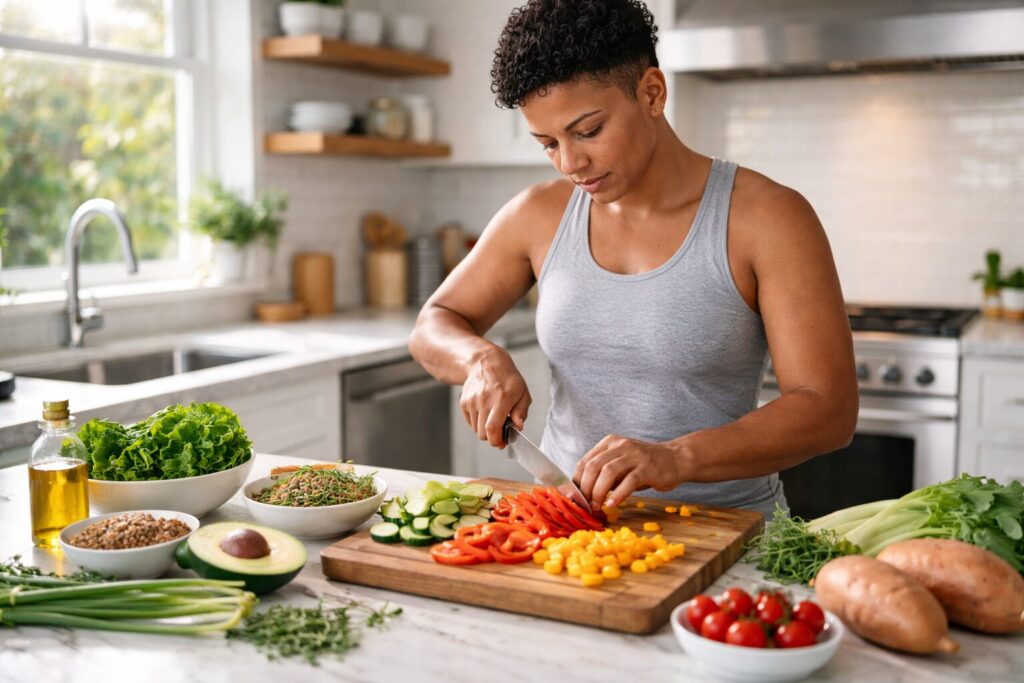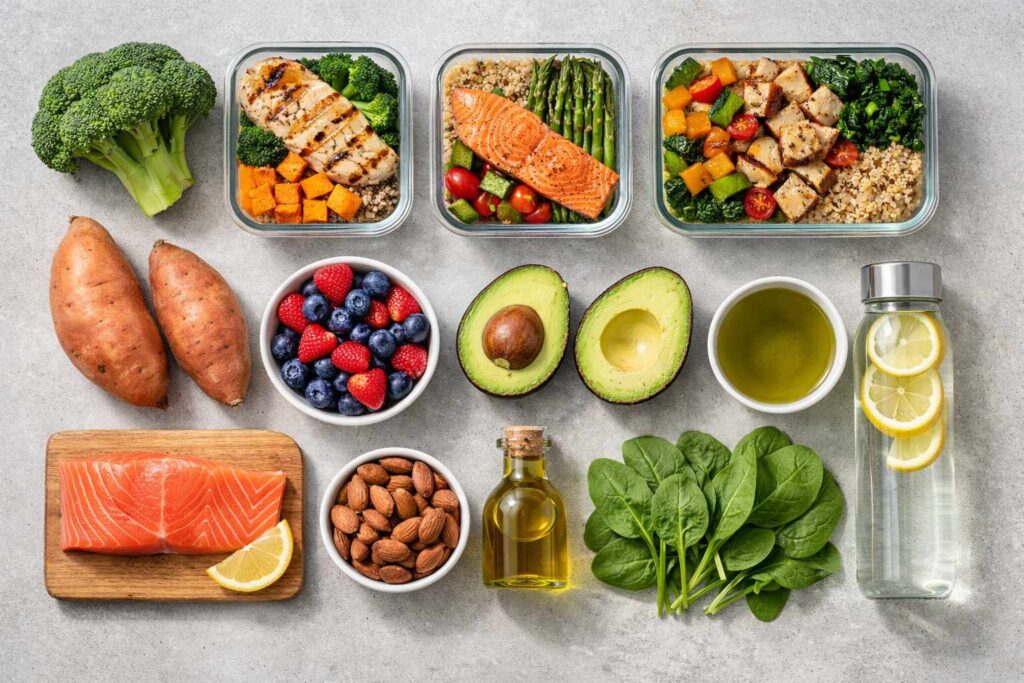 Foque na hidratação com uma meta de 0,5-1 onça de água por libra de peso corporal. Adicione uma pitada de sal marinho e limão à água da manhã para suporte natural dos eletrólitos. Suas refeições devem se concentrar em proteínas magras (mire 0,8-1g por libra de peso corporal), vegetais coloridos e gorduras saudáveis provenientes de fontes como abacates, nozes e azeite de oliva.