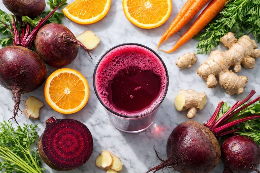 Pesquisa publicada no periódico Hypertension demonstra que o suco de beterraba pode temporariamente baixar a pressão arterial devido ao seu alto teor de nitratos. Esses nitratos naturais se convertem em óxido nítrico no corpo, dilatando os vasos sanguíneos e melhorando o fluxo de oxigênio para o cérebro, coração e músculos.