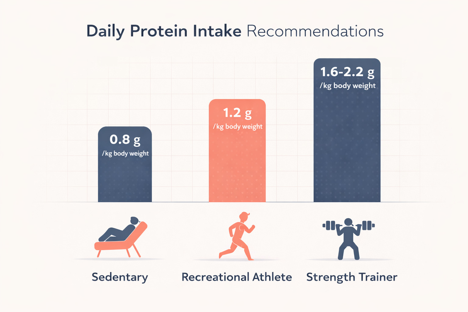 - Recreational exercisers: 1.2–1.4 g per kg/day